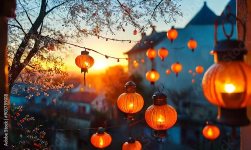 warm sunset casts golden glow on tree-lined street, with orange lanterns suspended from wires and white
