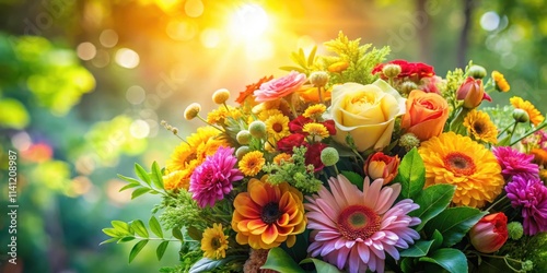 Warmly glowing flowers, surrounded by lush greenery and vibrant colors , floral bouquet