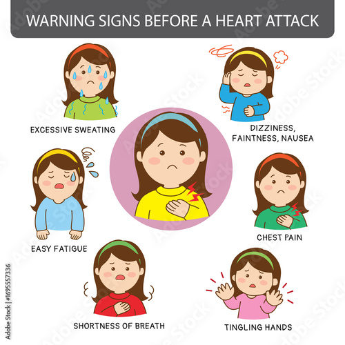 heart attack, signs, warning, cardiovascular, woman, patient, chest, pressure, attack, sweating, dizziness, faintness, nausea, blood flow, illustration, cartoon, white background, stress, diagram, wellness, blockage, health, symptom, cardiopathy, disease, education, treatment, emergency, pain, cardiology, medicals, nubes, health care, disease, risk