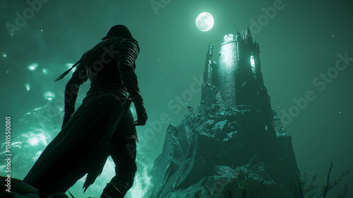 warrior, tower, moon, green, fantasy, adventure, mystery, night, magic, dark, silhouette, castle, ruin, epic, mythical, supernatural, eerie, ominous, hero, quest, journey, danger, exploration, rpg, game, digital artwork, cinematic, atmospheric, woman, fashion, people, dance, beauty, black, person, underwater, art, gothic, smoke, halloween, body, soldier, party, gun, wreck, dancer