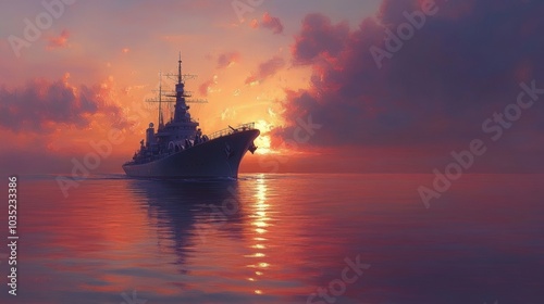 Warship Sailing into Sunset with Dramatic Sky and Ocean Reflection