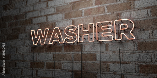 WASHER - Glowing Neon Sign on stonework wall - 3D rendered royalty free stock illustration. Can be used for online banner ads and direct mailers..