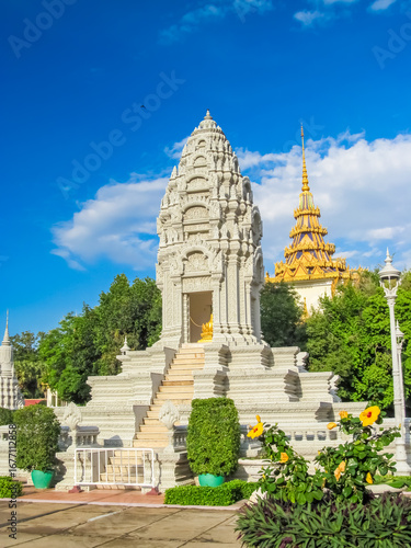Wat Phnom in the Palace of Phnom Penh, Cambodia. Asian Buddhist Temple in the palace of Cambodia capital Phnom Penh, Wat Phnom. Sunny day with clear blue sky