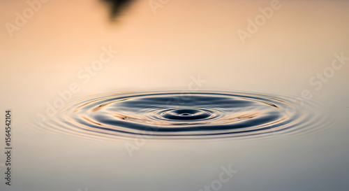 Water Droplet Ripple: A single droplet of water falls onto a still surface, creating concentric ripples that spread outwards, reflecting the soft hues of a sunset sky.