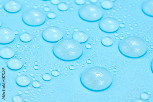 Water drops on blue background texture. Backdrop glass covered with drops of water. bubbles in water