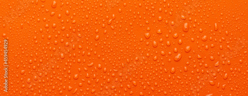 Water drops on metal, orange background. May used as background