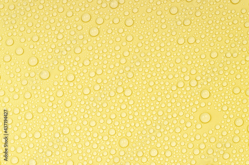 Water drops on yellow background texture. Backdrop glass covered with drops of water. yellow bubbles in water. beer texture
