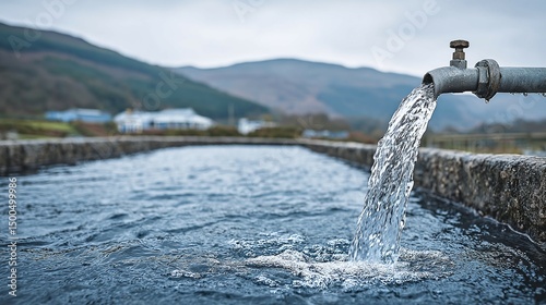 water, pipe, trough, flowing, mountain, nature, outdoors, liquid, clear, clean, stream, resource, environment, conservation, supply, irrigation, agriculture, rural, landscape, sky, tap, metal, grey, blue, fresh, drinkable, purity, natural, scenery, countryside, water source, sustainable, waterway, grooved, aqueduct, water supply