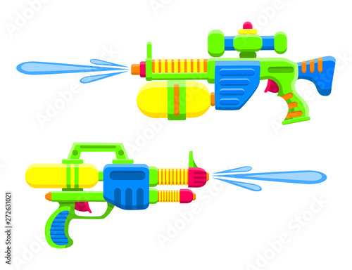 Water guns. Bright multi-colored childrens toys. Isolated objects. Flat vector illustration on white background.