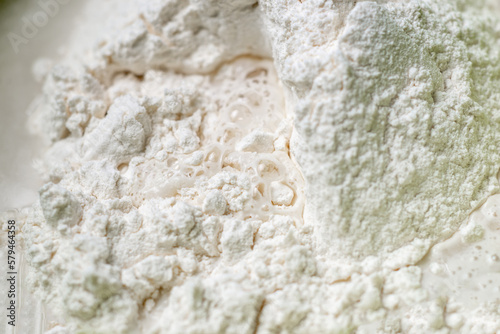 water is added to flour. Kneading dough for cooking. Close-up. Flour and water are mixed.