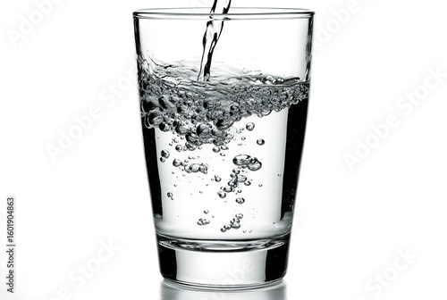 Water is being poured into a clear glass creating bubbles and motion against a