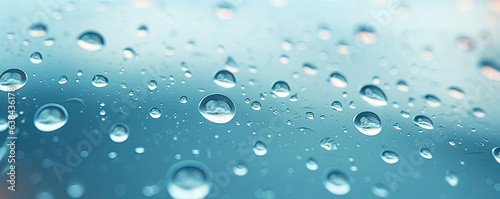 Water or oil drops on glass surface in blue colors. Dropslet close up.