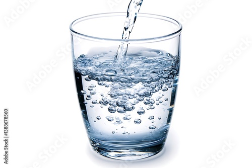 Water Pouring into Glass with Bubbles, Fresh Liquid, Clear Container, White Background