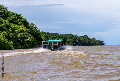 Water spray and waves from fast moving tour boat in the Tortuguero National Park of Costa Rica