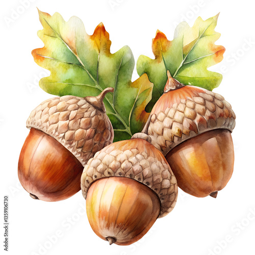 watercolor, acorn, oak, isolated, autumn, nature, tree, nut, white, seed, brown, acorn, fruit, green, fall, macro, food, season, leaf, forest, plant, closeup, closeup, object, botany, wood