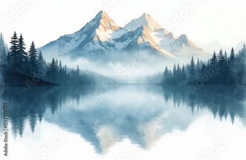 Watercolor art painting of mountain lake with reflection. Pine trees silhouettes, snow capped mountains, serene landscape scenic view. Misty fog at dawn. Artistic travel vacation background.