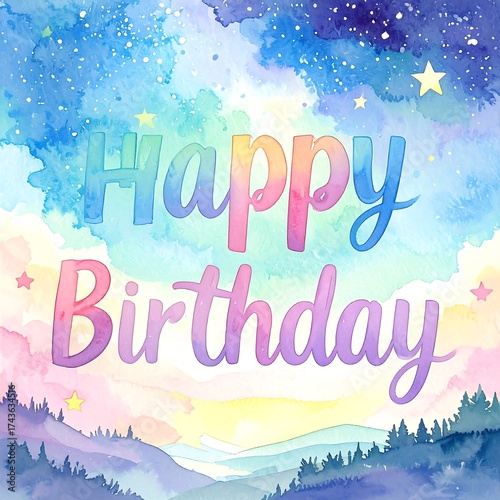 birthday, greeting, card, watercolor, starry, sky, cloud, rainbow, pastel, mountain, landscape, happy, celebration, colourful, vibrant, text, design, artistic, whimsical, cute, pretty, festive, wishes, background, star, tree, sunset, sunrise, nature