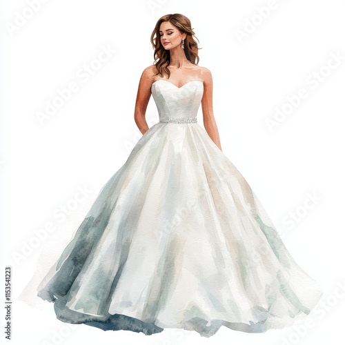 bride, wedding, dress, gown, watercolor, painting, illustration, full body, pastel, colours, soft, whimsical, design, cosy, warm, isolated, white background, woman, fashion, style, elegant, romantic, beautiful, art, artwork, bridal, ceremony