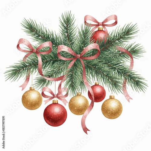 watercolor, christmas, decoration, pine, holly, berry, ribbon, bow, red bow, ornament, bauble, pine cone, evergreen, foliage, festive, holiday, garland, christmas, seasonal, celebration, decorative, illustration, white background, minimal, golden star, christmas ornament, botanical, hand-painted, hi-res, square, clip art, isolated, elegant
