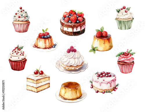 Watercolor Christmas Desserts Illustration Festive Cupcakes, Cakes, Puddings, Holiday Sweets with Berries, Whipped Cream, Caramel, and Seasonal Decorations