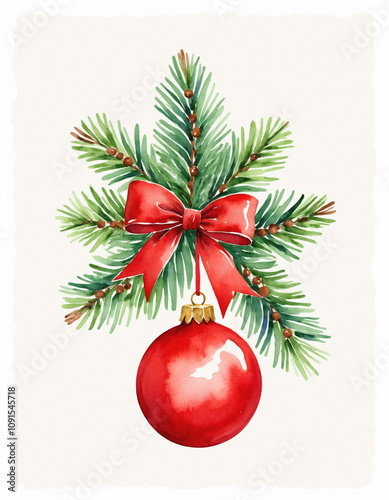 Watercolor christmas illustration of red ball with red ribbon and christmas tree branches on white paper background. New Year festive decor for poster, greeting card, sticker, packaging, print.