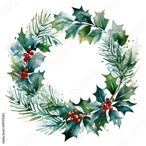 Watercolor Christmas wreath. Traditional decor element.