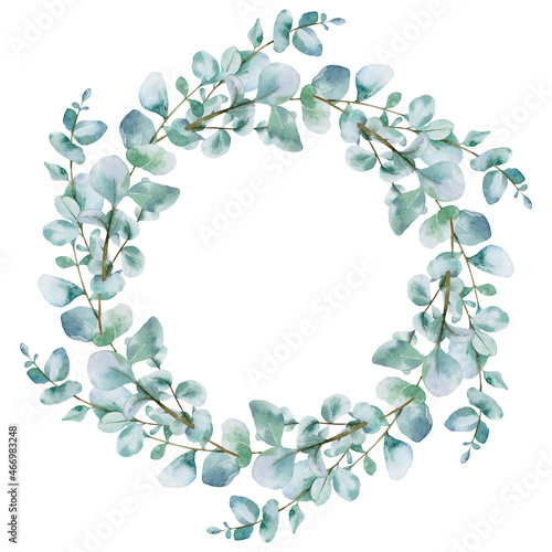 Watercolor Christmas wreath with eucalyptus branches. Hand painted holiday frame with greenery isolated on white background. Floral frame. Winter Save the Date. Watercolor Eucalyptus Greenery frame