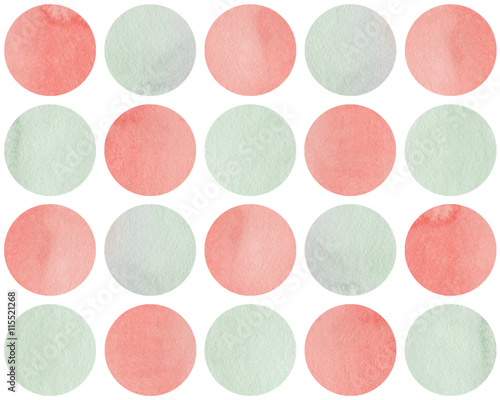 Watercolor circles in pink and light green color isolated over white.