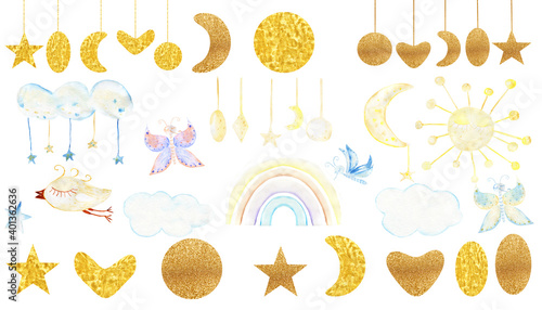 Watercolor clouds, rainbow, moon, stars,bird, butterfly, sun, Sleeping set. Children's Illustration.