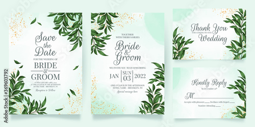 Watercolor creamy wedding invitation card template set with golden floral decoration