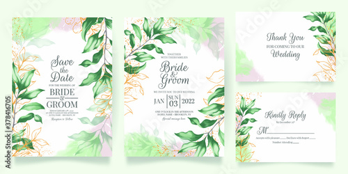 watercolor creamy wedding invitation card template set with golden floral decoration