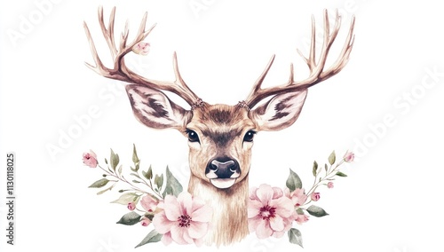 cervid, watercolor, floral, wildlife, animal, art, nature, elegant, portrait, painting, flower, rose, spring, blossom, pink, brown, antler, head, fauna, mammal, buck, stag, illustration, botanical, artistic, beautiful, soft, delicate, pretty, cute, charming, peaceful, serene, calm, gentle, whimsical, romantic, pastel, white, background