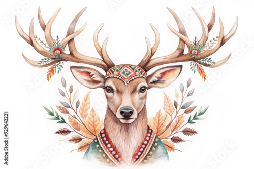 cervid, stag, antler, autumn, leaf, foliage, timberland, forest, nature, wildlife, animal, watercolor, painting, illustration, art, design, graphic, digital artwork, cute, adorable, beautiful, elegant, rustic, whimsical, festive, holiday, fall, thanksgiving, christmas, decor, print, card, poster, greeting, invitation, pattern, background, texture, white background, isolated, hand-painted, home decor