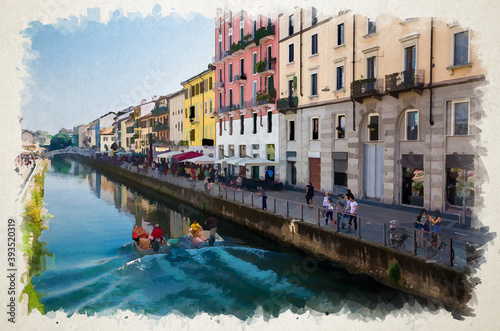 Watercolor drawing of Milan: people is sailing on motor boats in water of Naviglio Grande grand canal waterway, embankment, promenade and typical colourful buildings in summer day with blue sky