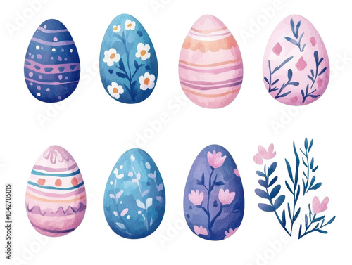Watercolor Easter Eggs in Grass: Pastel Stripes, Dots, and Geometric Designs