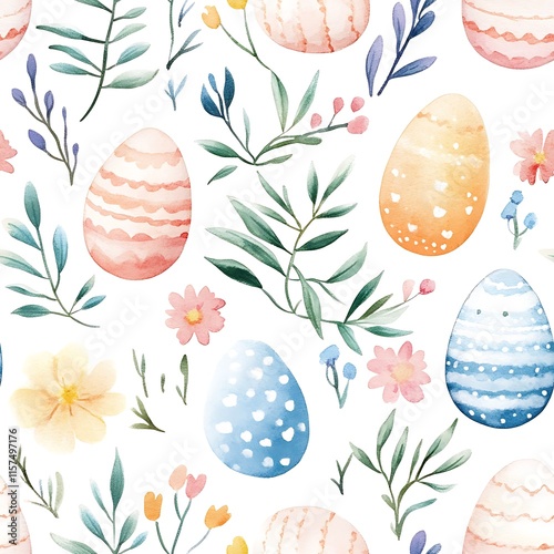 Watercolor Easter seamless pattern, floral and egg