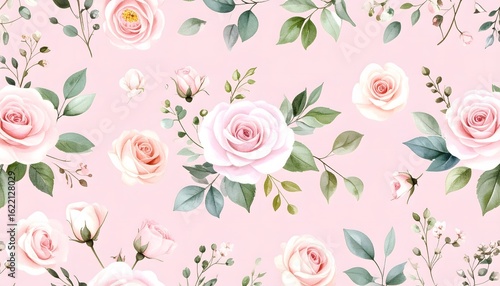 rose, rose, pink, floral, flower, flower, bloom, blooming, blossom, blossom, leaf, leaf, green, watercolor, illustration, seamless, pattern, background, design, art, nature, botanical, elegant, romantic, delicate, beauty, spring, summer, wedding, invitation, greeting, card, decoration, decorative, pastel, soft, feminine, pretty, arrangement, bouquet, garden, bud, stem, tree branch, foliage, texture, surface, wallpaper