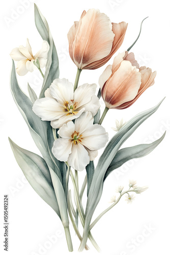 watercolor, flower, bouquet, tulip, daffodil, floral, peach, white, illustration, art, nature, botanical, bloom, blossom, green, leaf, elegant, wedding, romantic, beautiful, arrangement, isolated, soft, creative, hand-painted, painting, feminine, stylish, natural, pastel, classic, vintage, decorative, garden, colourful, spring, artistic, chic