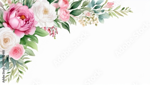 watercolor floral corner border with pink and white peonies roses and greenery on white background