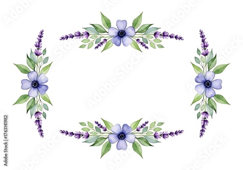 watercolor, floral, frame, lavandula, blue, flower, elegant, invitation, design, botanical, nature, art, illustration, decorative, border, chaplet, leaf, purple, green, romantic, spring, summer, garden, blooming, artwork, hand-drawn, template, greeting, card