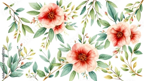 Watercolor floral illustration set - flower and green gold leaf branches bouquets collection, for wedding stationary, greetings, wallpapers, fashion, background. Eucalyptus, olive, green leaves
