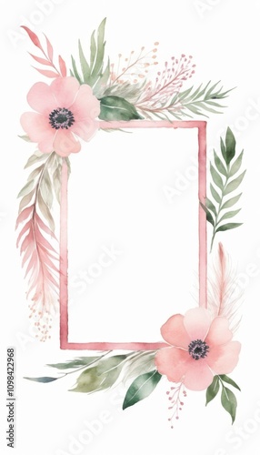 watercolor, illustration, floral, pink, flower, greenery, frame, decorative, nature, background, copy space, design, art, invitation, announcement, botanical, plant, flower petals, soft, colours, elegant, blank, space, creativity, aesthetic, stationery, feminine, home, decor, wedding, card, border, romantic, seasonal, celebration, gift, craft, vibrant, lovely, hand-made, blossom, fresh, charming, vintage, visual, textural, flower, arrangement