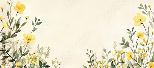 flower, floral, yellow, watercolor, leaf, spring, plant, nature, illustration, art, design, background, botanical, drawing, pattern, summer, texture, tree branch, vintage, artwork, frame, painting, paper, decoration, graphic, herbal, artistic, element, decorative, blossom, foliage, template, border, invite, wedding, card, beige, calm, clean, copy space, elegant, hand-painted, invitation, line, minimalist, no people