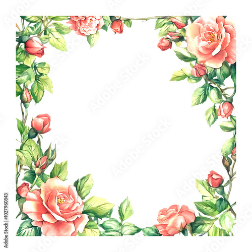hand-painted, watercolor, frame, template, blooming, rose, leaf, design, charming, elegant, sophisticated, unique, colourful, fresh, modern, vibrant, detailed, appealing, artistic, inviting, picturesque, creative, rich, beautiful, high-coloured, refined, striking, lovely, dynamic, cheerful, delicate