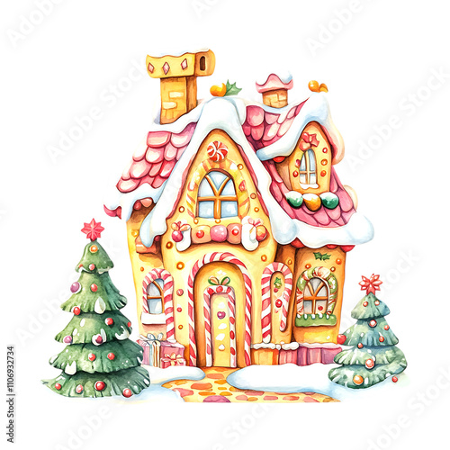 gingerbread house, christmas, holiday, watercolor, illustration, candy cane, snow, christmas tree, red roof, candy, decoration, winter, festive, sweet, treat, magical, cosy, winter landscape, holiday spirit, festive season, christmas, winter scene, whimsical, delightful, cute, adorable