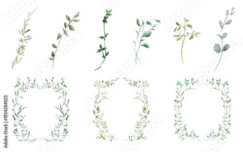 Watercolor greenery foliage frames and clip art, modern greenery leaves