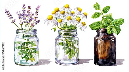herbal, medicine, jar, lavandula, chamomile, mint, watercolor, wellness, natural, healing, botanical, leaf, remedy, calm, soothing, aromatherapy, holistic, organic, plant, herbalism, flower, gentle, soft, glow, vibrant, therapy, nature, fresh, purity, balance, harmony, peaceful, aroma, health, treatment, blend, crafted, delicate, foliage, calming, restorative, vitality, essence, fragrance, tonic, extract, calmness