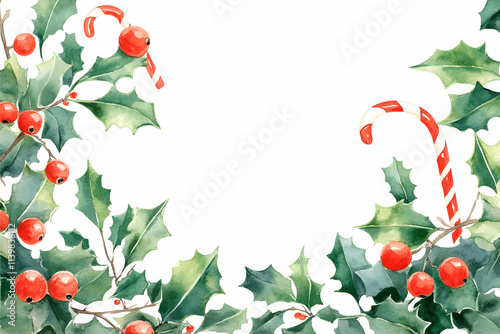christmas, holiday, winter, festive, celebration, red, green, candy, cane, holly, berry, leaf, tree branch, illustration, design, background, frame, border, decoration, card, invitation, template, watercolor, painting, artwork, graphic, image, picture, element, seasonal, merry, joyful, cheerful, sweet, traditional, classic, elegant, simple, nature, plant, symbol, season, december, christmas, greeting, banner