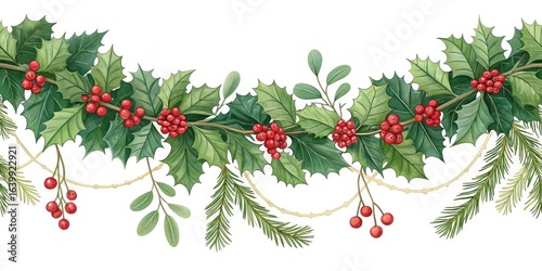 christmas, holly, watercolor, garland, botanical, holiday, border, festive, decor, winter, berry, leaf, red, green, illustration, painting, artistic, hand-made, elegant, natural, season, december, ornament, celebration, traditional, design, floral, artwork, tree branch, evergreen, watercolor, card, frame, graphic, isolated, plant, style, vintage, aquarelle, drawing, paper, pattern, texture, background, merry, bright, creative, detail