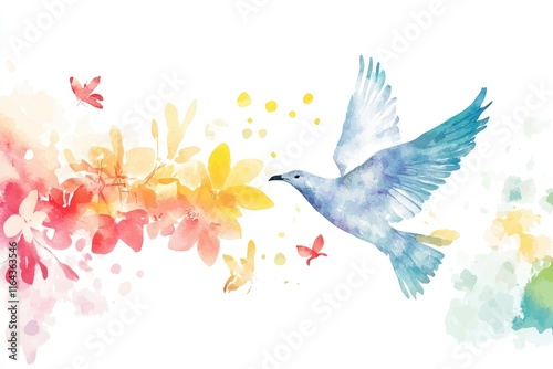Watercolor illustration of a bird surrounded by colorful flowers